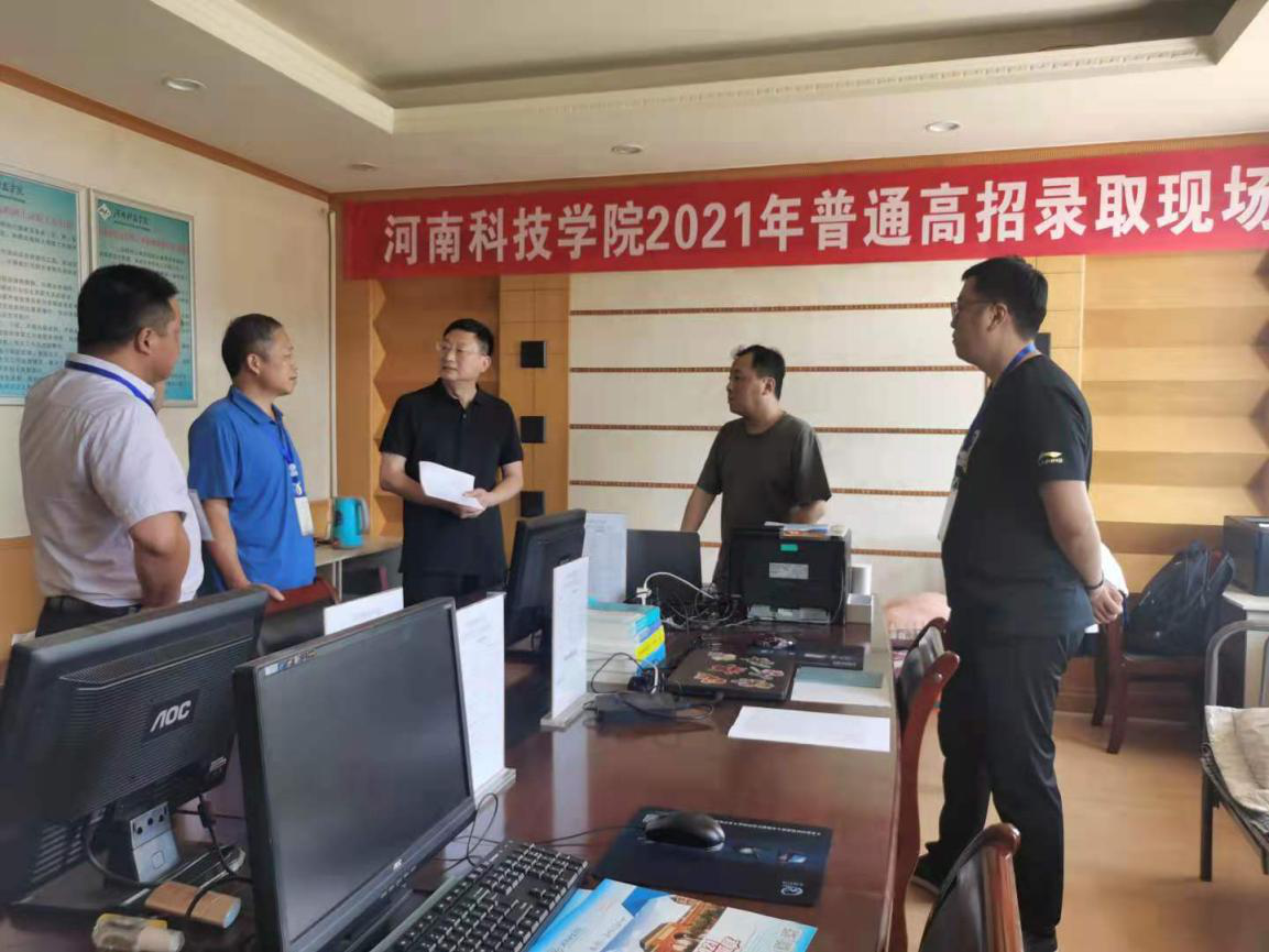在远程招生录取现场,何松林认真听取了我校2021年招生录取进展及抗洪救灾工作情况的汇报,并详细询问了已完成批次各专业的报考率、一志愿率、生源质量等情况。