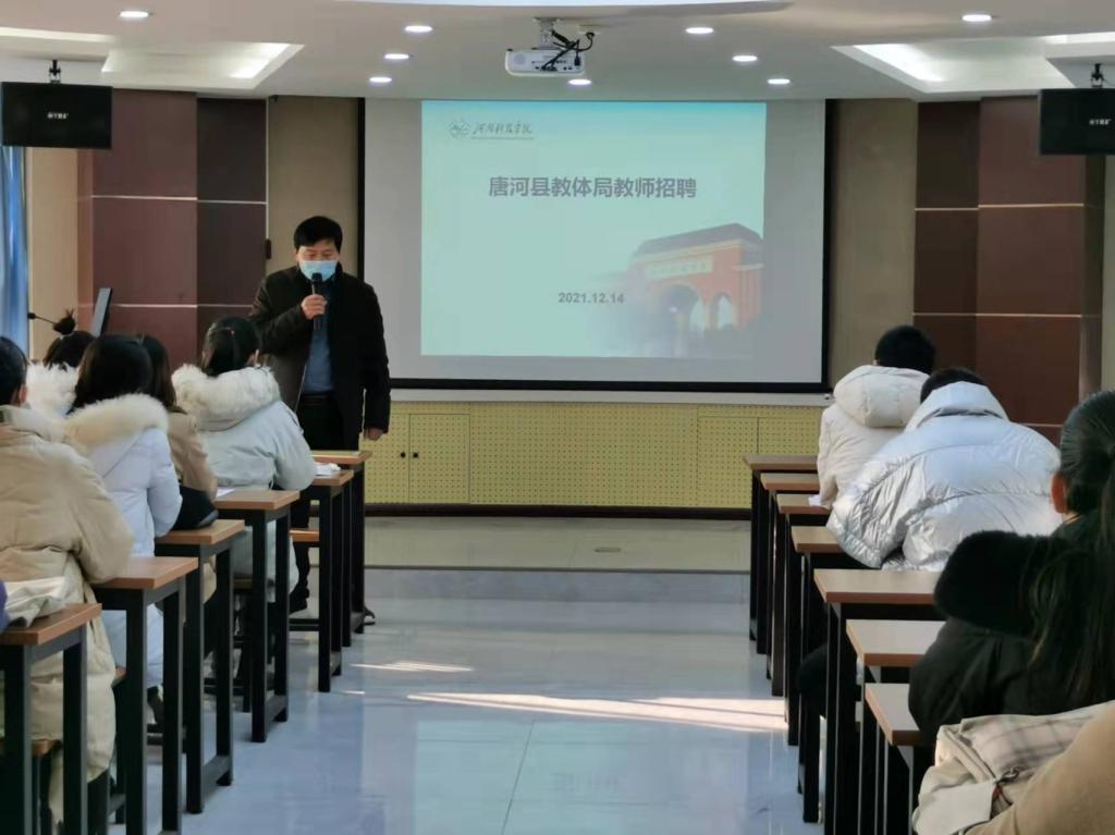 12月14日,唐河县教体局带领唐河县友兰实验高中、文峰高中、十九高中、中等职业学校等学校领导组团来我校招聘人才,并在我校实验楼招聘大厅A300举行宣讲会。