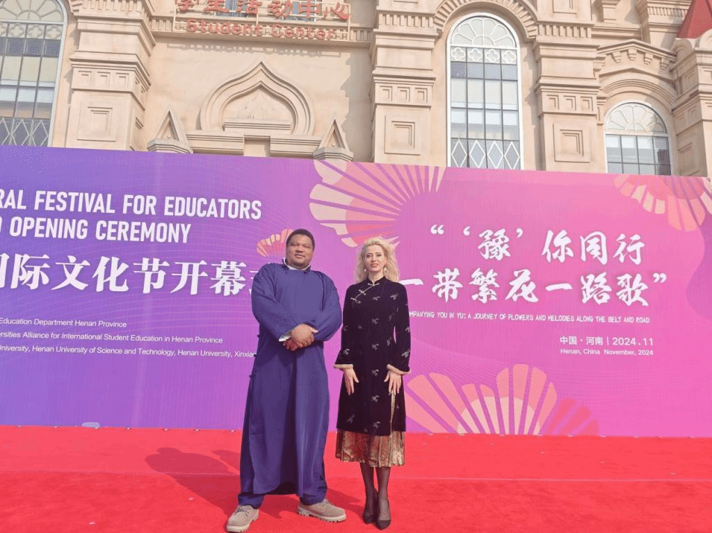 11月1日-2日,我校外教参加河南省首届“‘豫’你同行,一带繁花一路歌”中外师生国际文化节。活动现场,彩旗飘扬,欢声笑语,各国师生身着民族盛装,共同庆祝这一文化盛宴。我校外教身着中华民族传统服饰,面带温暖的笑容,精神饱满地步入会场,赢得了现场观众的阵阵掌声。