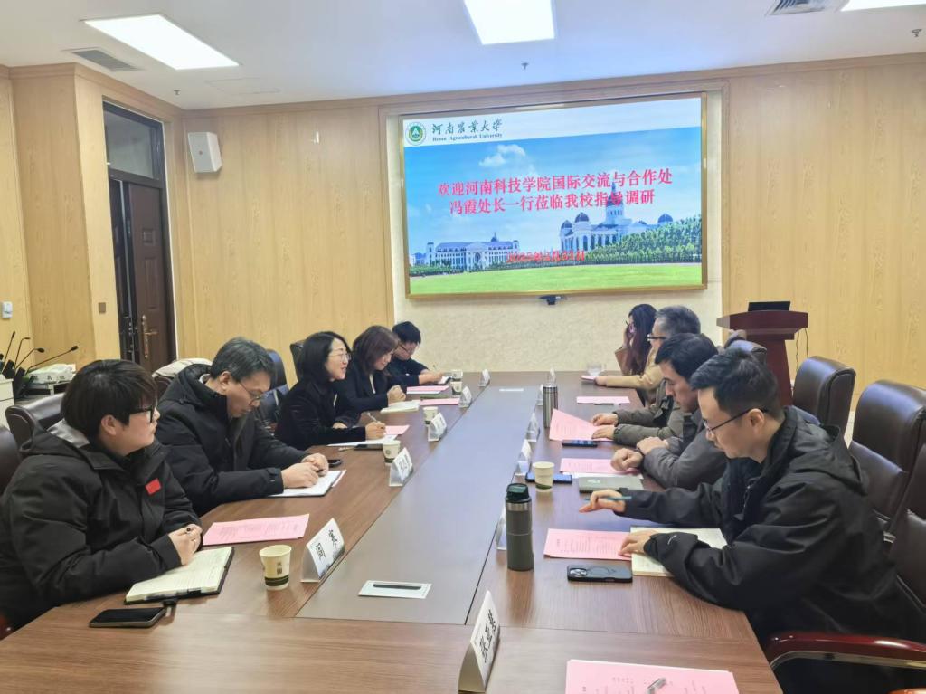 2月21日上午,国际交流与合作处处长冯霞率队赴河南农业大学调研学习国际化教育工作。河南农业大学国际交流合作处处长屠克、国际教育学院党委书记赵宁及其它相关人员参会,双方围绕国际化人才培养、境外合作办学模式优化等议题深入交流。