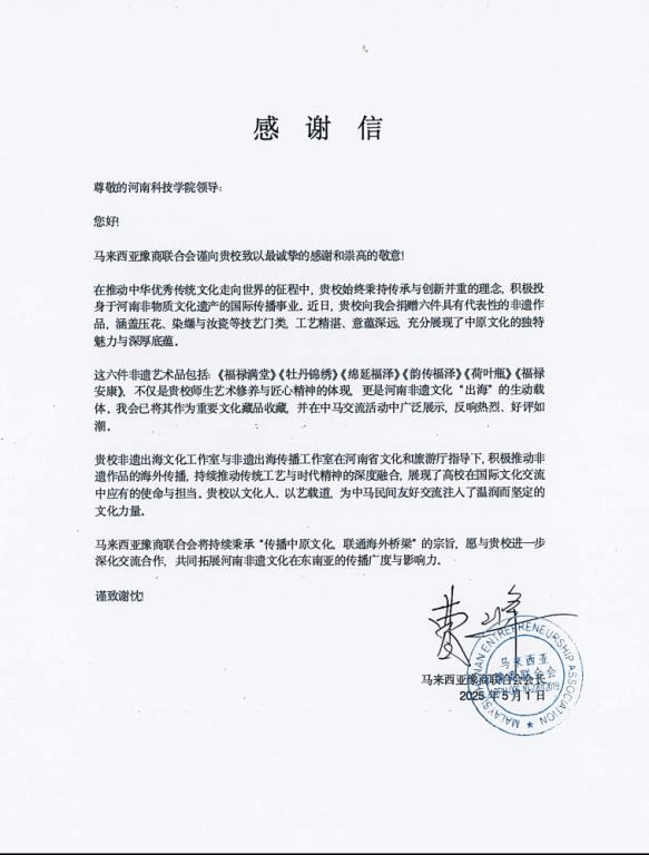 双方将以此次见面为契机,拟签订战略合作协议,建立长效沟通机制,深化多层次合作,推动项目落地。未来,在省教育厅、文旅厅及相关部门的指导下,双方将合力拓展我校非遗文化在东南亚地区的传播广度与影响力,助力中原文化远扬。