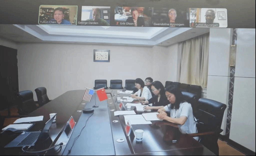 冯霞重点介绍了我校历史沿革、教学科研和国际化建设成果。李小丽就教科院专业设置、师资力量及近年发展作详细说明。美方代表Gwendoline Ayuninjam 分享了该校在种族多样性建设、教师资格认证等领域的成就,并特别提出拟于7月初来访我校,实地考察教科院、新乡高中教育教学现状,以及我校非遗国际传播工作室的发展运营,为后续组织学生研学奠定基础。