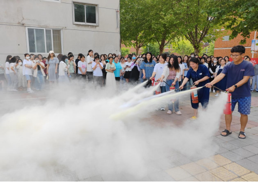 二是安排保卫人员对在场师生进行了灭火器使用培训,重点向大家讲解了灭火器的分类、工作原理、使用方法及注意事项,并手把手教大家如何使用。师生们认真聆听讲解,细心体会操作,很快掌握了灭火器使用方法。