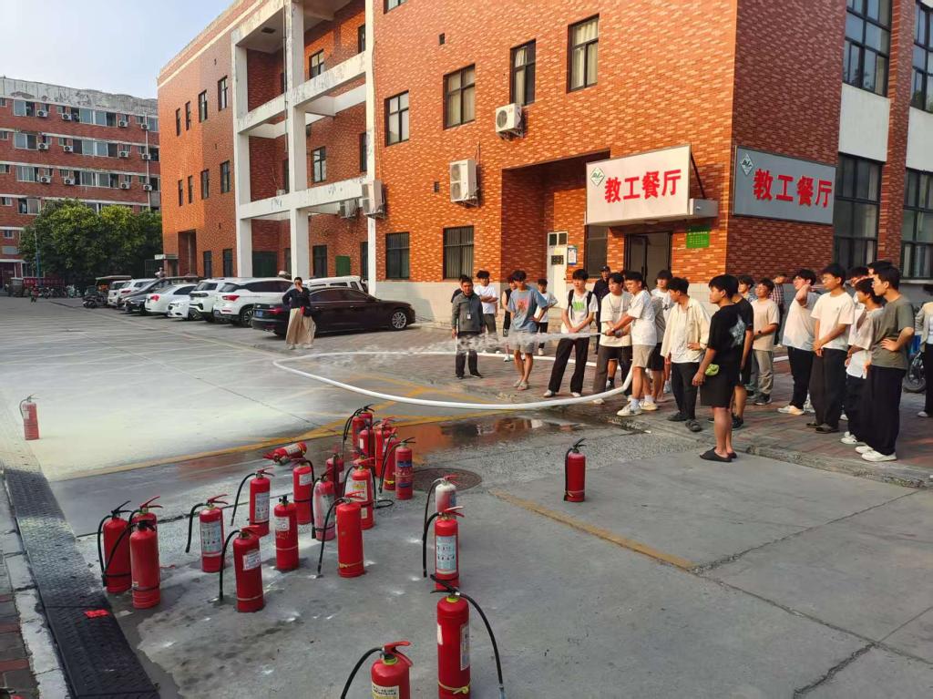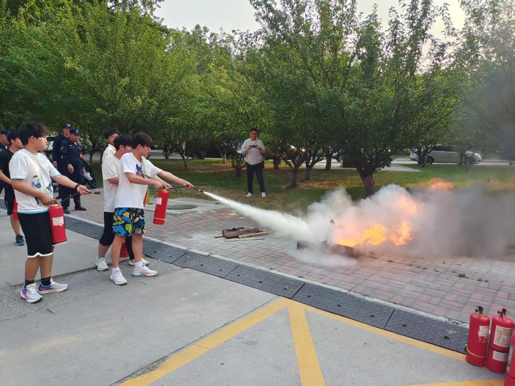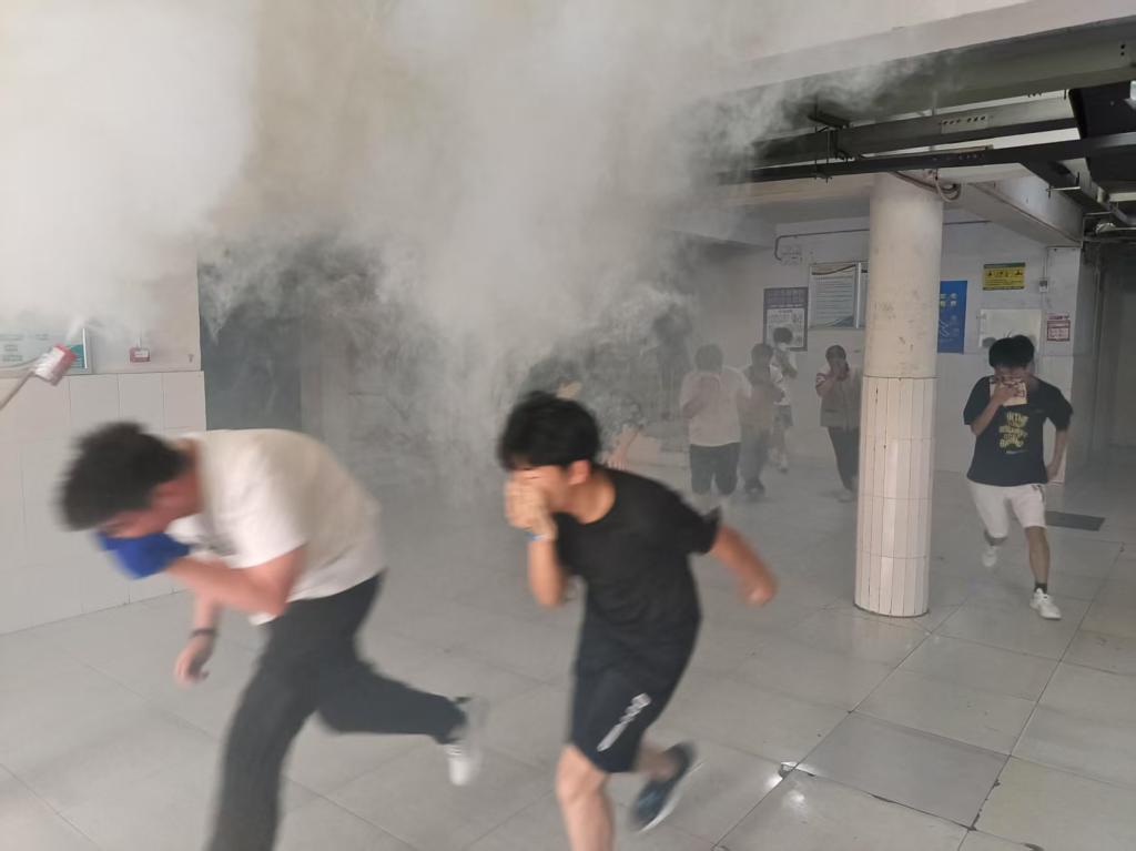 演练前,保卫处工作人员在楼道处张贴消防安全警示及消防逃生火灾防范知识。随着警报声响起,演练正式开始。参与师生用湿毛巾捂住口鼻,沿指定疏散路线快速撤离至楼外安全区域,整个过程井然有序。保卫处工作人员现场演示灭火器、消火栓的使用方法,“提拔握压,对准火焰根部喷射……”师生们在指导下实操灭火,掌握“小火会用灭火器、大火会用消火栓” 的技能。