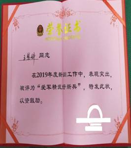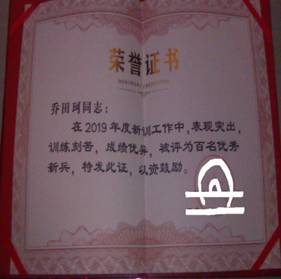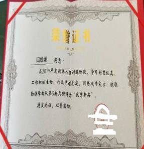 2.乔田珂,男,食品学院烹饪181班学生,现服役于中国人民解放军海军陆战队某部。在新兵连训练期间,训练刻苦,表现突出,成绩优异,被评为“百名优秀新兵”。