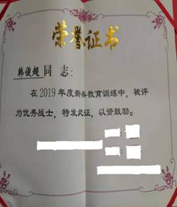 6.韩俊超,男,高职学院机械制造与自动化2018级学生,现服役于中国人民解放军武装警察部队北京某部。在新兵连训练期间表现突出,被评为“优秀战士”。