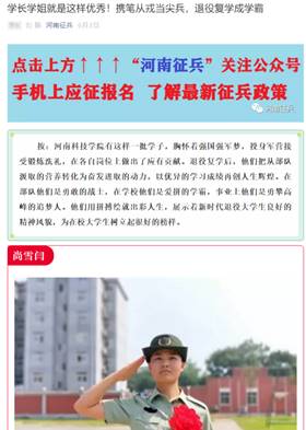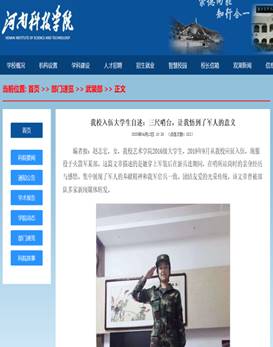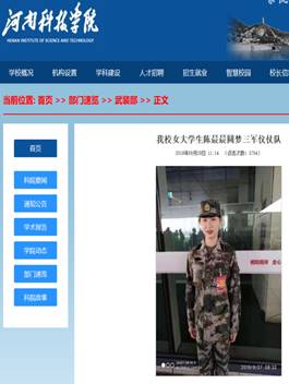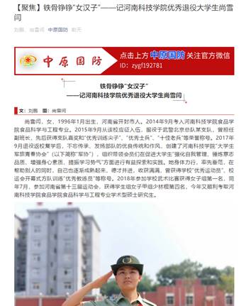 三是在考研成绩公布后,及时收集今年考上研究生的退役大学生,撰写发表了《从戎报国不忘攀登路,退役潜耕再圆考研梦》(此稿件被“河南征兵”转载)。此外,我们还围绕我校第一个入伍到三军仪仗队的陈晨晨撰写了《陈晨晨梦圆三军仪仗队》的报道,点击率达4000余人次;围绕我校优秀退役大学生尚雪闫的成长历程,充分挖掘优秀特质,撰写了《铁骨铮铮女汉子》(此稿件被“中原国防”转载)事迹报道。