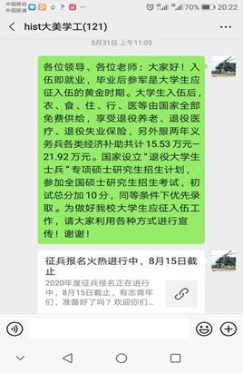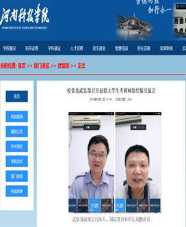 为化解疫情给征兵宣传工作带来的影响,进一步加强与学生的沟通交流,消除同学们的顾虑和困惑,让更多学生了解掌握入伍的政策、知识、程序和技巧,提高“三率”即办理手续的准确率、身体检查的合格率、入伍定兵的通过率,6月份,我们先后组织召开了《退役大学生考研网络经验交流会》,《大学生应征入伍政策网络咨询会》(此稿件被“河南征兵”转载),交流考研经验,宣传征兵政策,讲解体检知识,利用退役大学生现身说讲,解答同学们关心的热点问题。