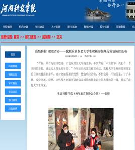 一是在疫情防控期间,我校退役大学生和有参军意向在校大学生积极参加家乡疫情防控,我们借机深挖典型,大力宣传优秀退役大学生先进事迹,撰写发布了《军魂永驻,初心不改——我校退役大学生积极参加地方疫情防控活动》、《疫情防控,绽放青春——我校应征报名大学生积极参加地方疫情防控活动》等新闻报道。