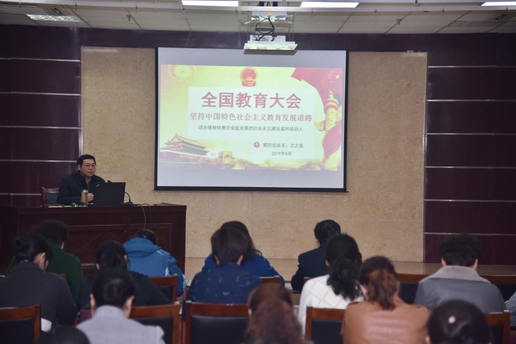 尤太生传达了关于《2019年全校师生员工政治理论学习安排意见》的通知要求,并从全国教育大会的会议背景、会议主要内容、习近平总书记心中的“好老师”及习近平总书记谈教育发展的金句等四个方面对全国教育大会精神进行了讲解。围绕“十个坚持、六个下功夫、三个牢固树立、四个有好老师标准”等方面详细解读了习近平总书记在教育大会上的重要讲话。尤太生指出,全国教育大会是在新的历史起点上开启了新时代教育事业新征程,为新时代教育改革发展的伟大实践指明了方向,对加快推进教育现代化、建设教育强国、办好人民满意的教育进行了全面系统部署。