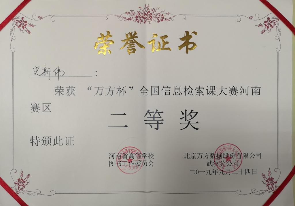 9月24日,由河南省高等学校图书情报工作指导委员会、郑州大学、北京万方数据股份有限公司联合举办的2019“万方杯”全国信息检索课大赛决赛在郑州大学图书馆第一报告厅圆满举办。我馆教职工史新伟荣获大赛二等奖。