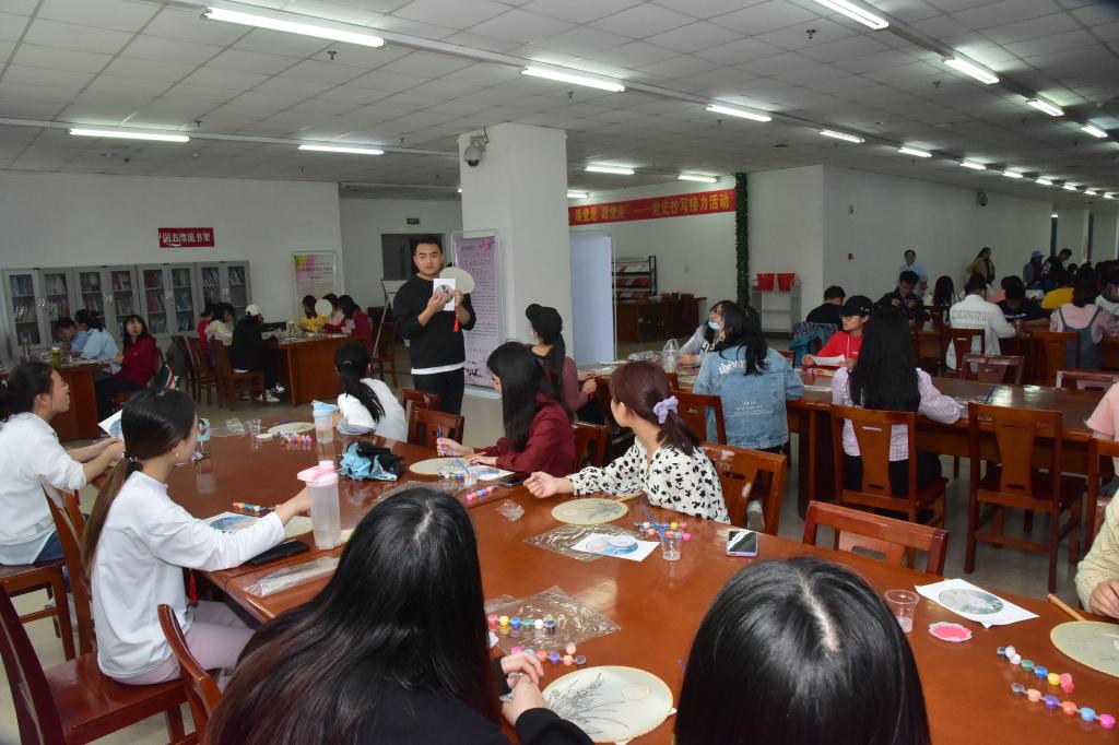 为弘扬中华传统文化,丰富校园文化生活,4月29日下午,图书馆在二楼东自修室举办了“逐梦新时代,书香绽牡丹”工笔团扇制作活动。艺术学院李玉霞老师带领8名国画专业学生应邀莅临现场并做全程指导,近200名师生参加活动。
