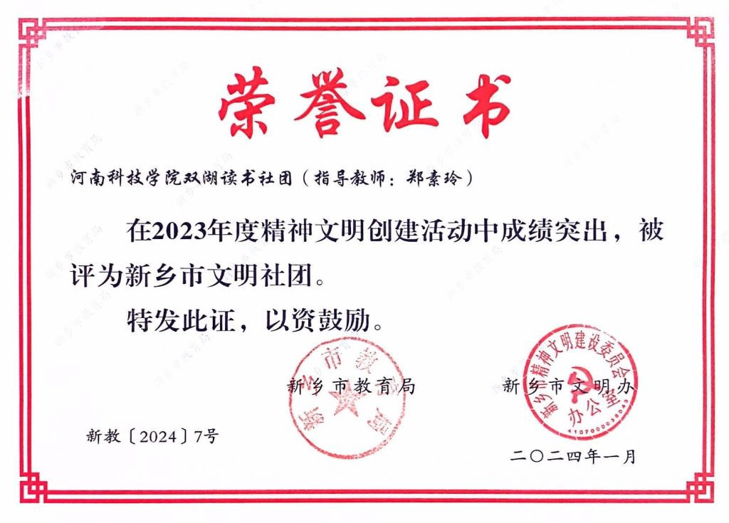近日,新乡市教育局、新乡市文明办公布了2023年度全市教育系统“两创两争”活动先进集体和先进个人评选结果,图书馆双湖读书社被评为新乡市文明社团。