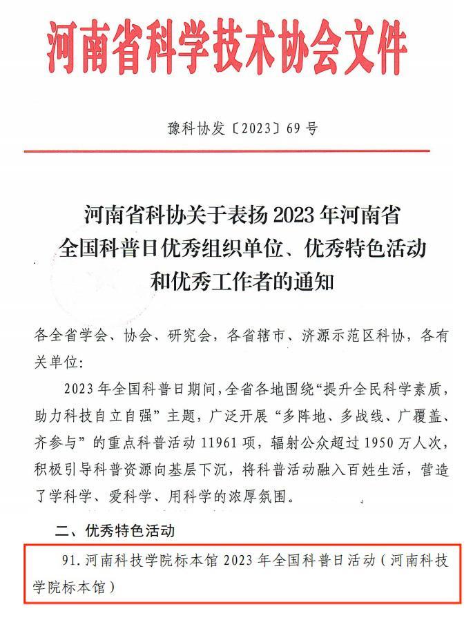 近日,河南省科协(豫科协发〔2023〕69 号)通报表彰了2023年全国科普日优秀组织单位、优秀特色活动名单。河南科技学院标本馆举办的全国科普日系列活动获评河南省“2023年全国科普日优秀特色活动”。