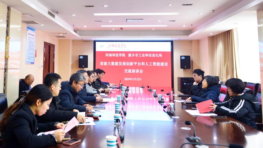 1月12日上午,新乡市工业和信息化局四级调研员张苏芳一行来我校就大数据与人工智能创新平台建设情况开展交流座谈。实验室与设备管理处处长李勇超、副处长马晶晶,机电学院、信息工程学院、计算机科学与技术学院以及人工智能学院副院长及平台秘书参加了座谈活动。