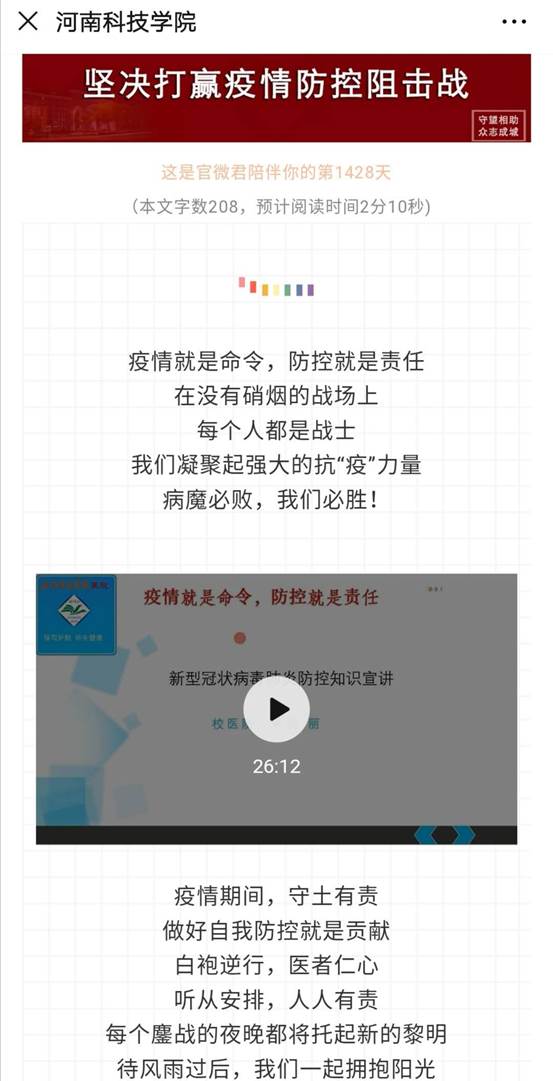 新冠肺炎疫情防控进入新阶段,为了巩固疫情防控稳定局面,国家卫健委及教育部发出了关于高校延迟开学的通知,很多老师和同学盼归心切,为了缓解师生的焦虑情绪,校医院副院长李艳丽为我校广大师生录制“新冠肺炎防疫知识”宣讲视频,通过河南科技学院新媒体工作室公众号向全校师生进行播放,得到广大师生的一致好评;还在在我校大学生健康教育网络课程中增加《新冠肺炎*番外篇》,该课程被广为转发,同学们纷纷反映:疫情期间听到自己校医院医生的讲解,对新冠肺炎有了更清晰准确的认识,心里不再恐慌了。