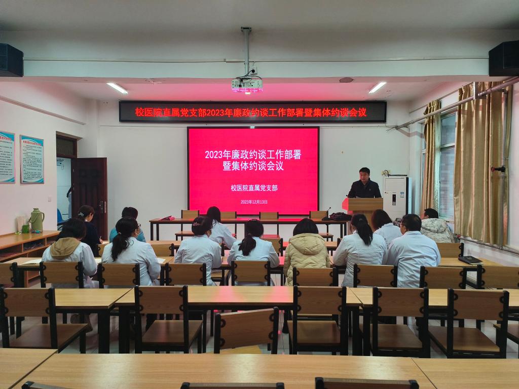 根据《关于在全校党员干部中开展“明方向、立规矩、正风气、强免疫”专题纪律教育2023年工作方案要求》(校纪字〔2023〕5号)和《关于开展2023年廉政约谈的通知》要求,12月13日上午,校医院在6楼健教教室召开2023年廉政约谈工作部署暨集体约谈会。班子成员、科级干部及全体党员参加,会议由直属党支部书记申长奎主持。