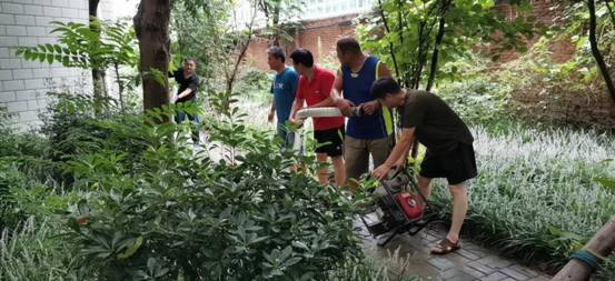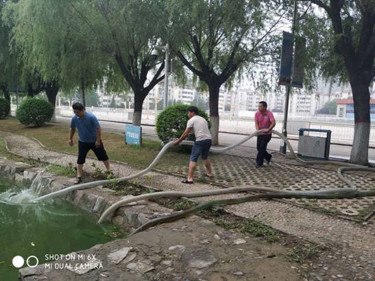 后勤服务中心副主任魏军鹏(左一)带领后勤员工抽排人工湖积水