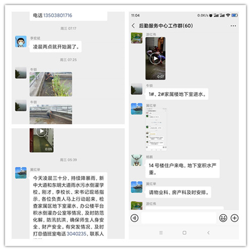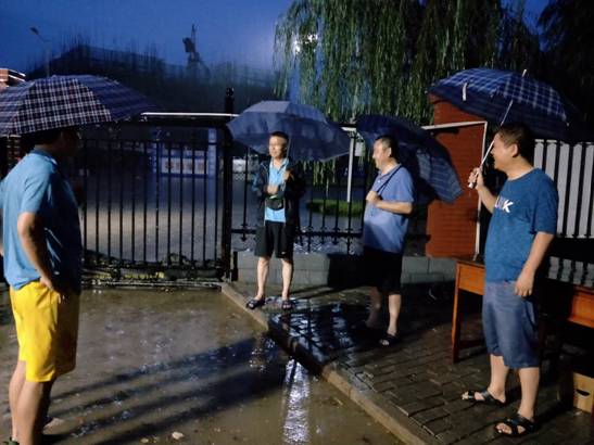 防汛如防疫,刻不容缓。“东区10#家属楼地下室积水严重”、“7#楼外语学院出现渗漏”、“14#学生宿舍屋顶下水管堵塞”、“4#楼地下室污水管漏水”“行政楼地下室配电房进水”……这是5日凌晨3点学校后勤服务中心工作群的状态。每一条汇报的后面,都是一个个湿透的身体,狂风暴雨,电闪雷鸣,没有吓退科院后勤人,他们出现在常人想象不到的地方,逐一巡查,排查各种隐患。抗汛过程中,校领导李成伟、宋亚伟多次到现场指导工作;第五党总支书记乔有职深入地下室排水抢险;中心主任冀红举带头搬沙袋,排险情。在领导的带领下,大家用最快的时间,将暴雨导致的内涝损失减到了最低程度。