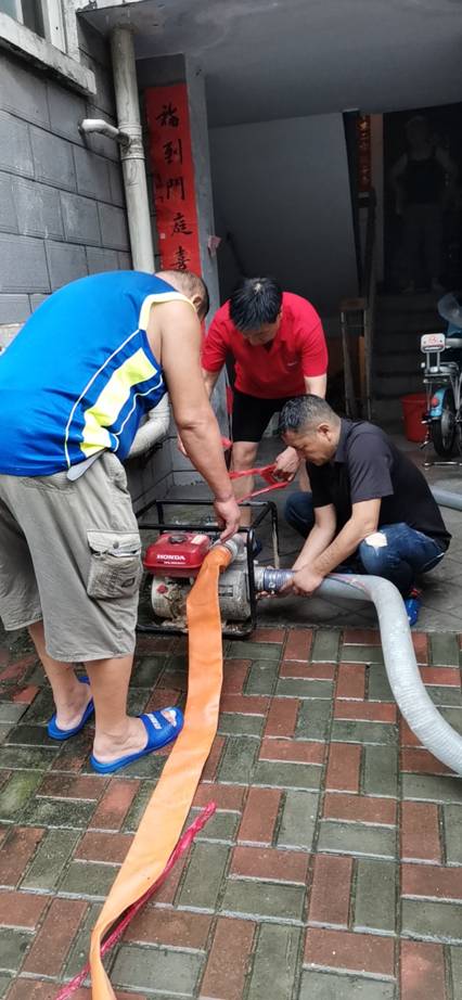 后勤服务中心副主任游红伟(左二)带领后勤员工安装抽水泵排水