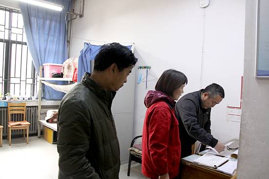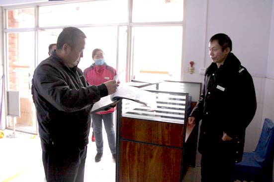 第五党总支书记乔有职、后勤服务中心主任冀红举检查教学楼值班记录
