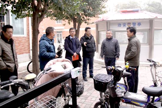 乔有职、冀红举等一行人先来到3号学生教学楼察看值班室工作记录,询问值班人员工作开展情况。随后,他们来到8#、9#学生宿舍楼检查标准化创建达标验收有关准备工作、现场充电桩安装使用情况,并来到学生餐厅检查指导管理工作。