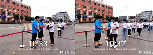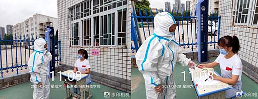 校外居住的学生在大学门口进行健康卡检查、消毒、测温等