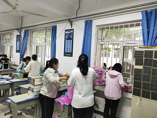 新书发放前,学校制定了严格的发放办法,从书本的统一消毒、人员安排、书本分装、分发的具体操作流程都进行了明确的要求,教师们按照“一生一袋”的分发办法,先装袋,再消毒,做到安全第一、准确无误。