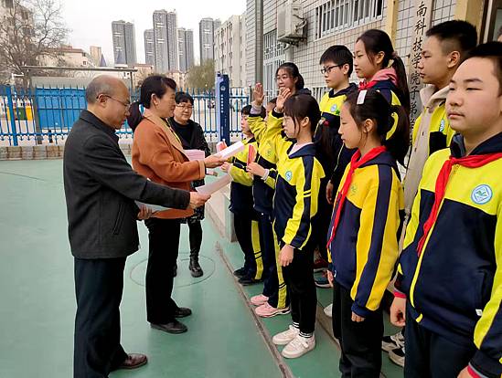 表彰仪式上,子弟学校副校长王德利宣读三好学生、优秀少先队员、优秀班干部、优秀少先队干部、进步生名单。校长郭斐杰、副校长李广州、教导主任张文香为优秀学生颁发奖状、奖品,并合影留念。