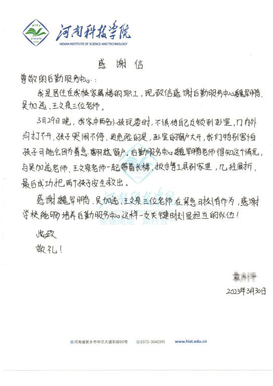近日,后勤服务中心收到我校职工的一封感谢信。信中对魏军鹏、吴加选和王文泉在紧急时刻担当作为,帮助职工解救被困家中两名儿童表达了诚挚谢意。