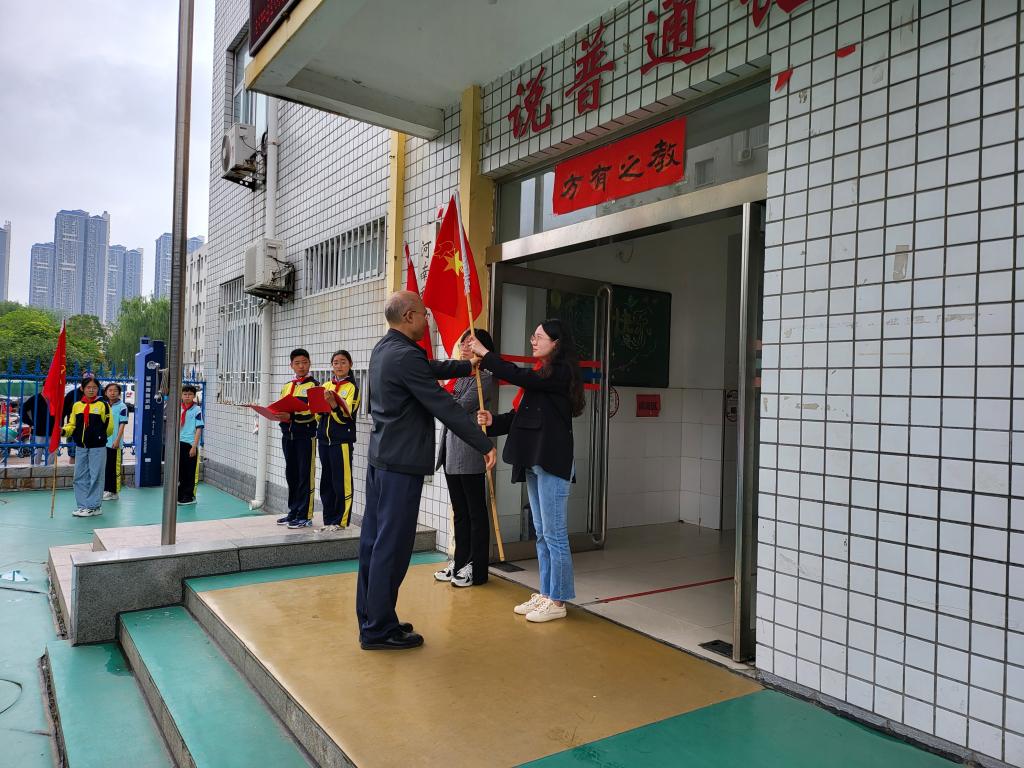 子弟学校副校长李广州为新成立的一年级中队授旗