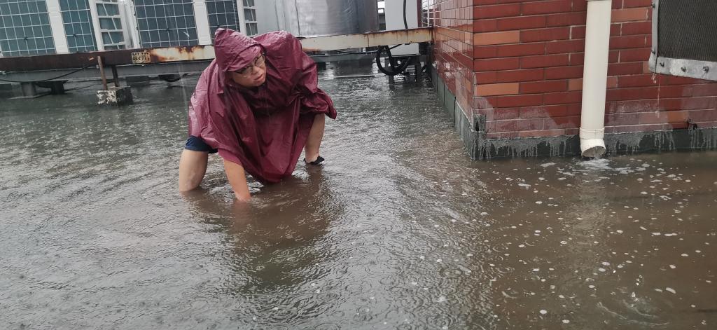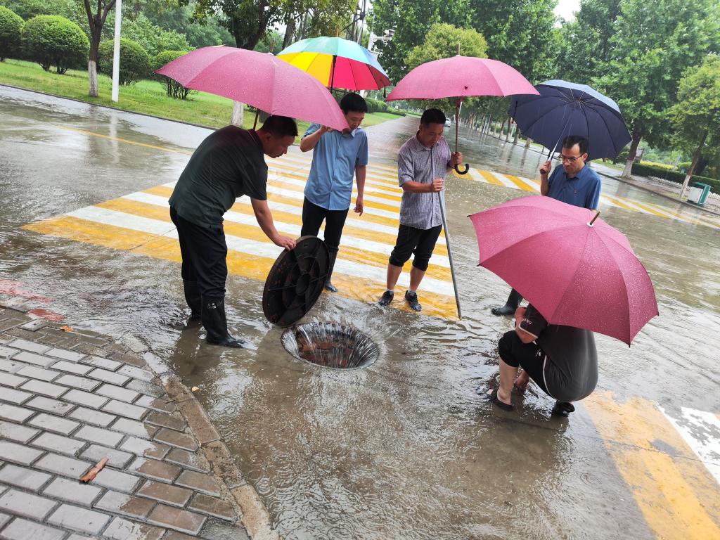 后勤服务中心党委书记龚俊朋、主任王吉田带领大家冒雨查看校园排水情况,清理积水较深的雨水井、排污井等,对校园西南门,东、西湖等排水不畅地点,现场制定方案,紧急实施。