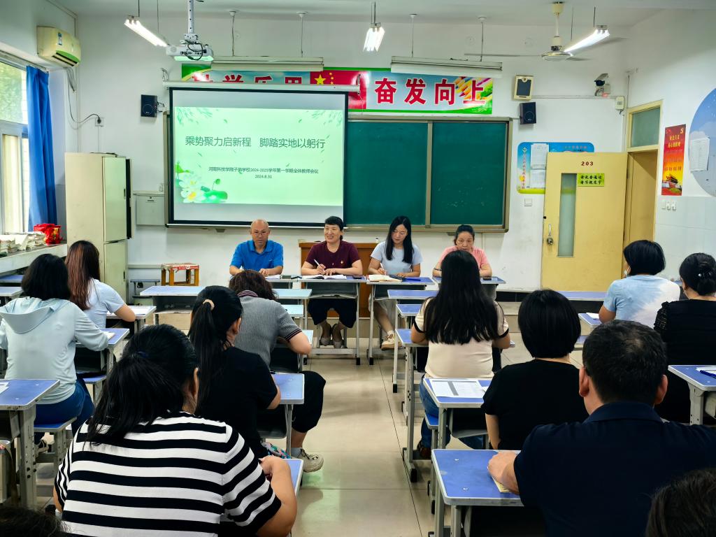 秋光为序催奋进,奋楫扬帆启新程。为全面做好新学期开学工作,8月31日上午,子弟学校在三一班教室召开2024-2025学年第一学期全体教师会议。校长郭斐杰,副校长赵文静、李广州分别作出发言。会议由教导主任郑玉芳主持。