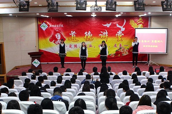 11月23日下午,由校文明办主办、教育科学学院承办的第七十二期道德讲堂在图教201举行。教育科学学院党政领导和师生代表200余人参加活动。