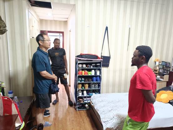近日新乡市出现特大暴雨,水灾频发,国际教育学院十分关心留校学生的生活状况。7月23日上午,国际教育学院负责人和工作人员涉水来到我校国际学生、合作办学学生和中乌联合研究生院学生宿舍,深入了解学生们的学习与生活情况。