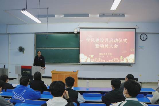 为更好地开展学风建设工作,11月11日下午,国际教育学院于三号楼合二教室召开“学风建设月启动仪式暨动员大会”,学院党总支书记张平、院长冯霞、副书记兼副院长吴艳兵和各班班主任出席本次会议,学生代表参加会议,辅导员苏娣主持会议。