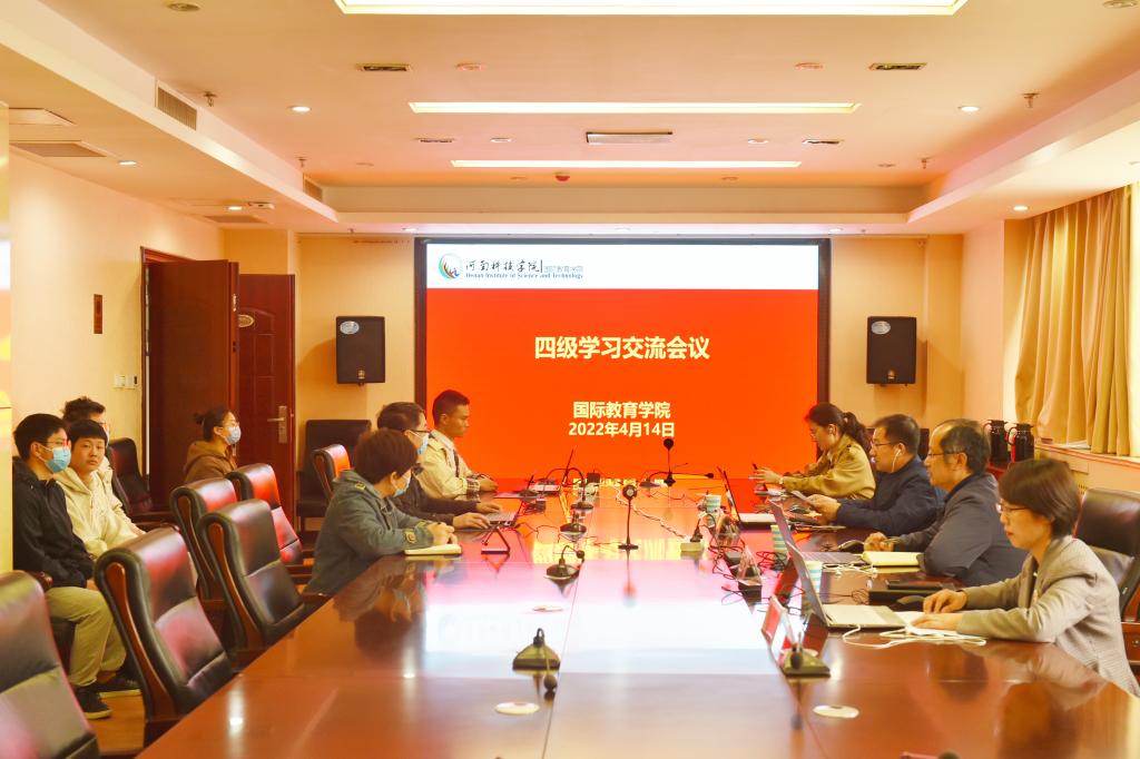为帮助学生顺利通过国家英语四、六级考试,提高学生英语运用技能和水平,4月14日下午,国际教育学院以线下线上相结合的方式召开英语四级学习交流会。学院党总支书记张平、院长冯霞、副书记兼副院长吴艳兵和教师、学生代表参加了会议。