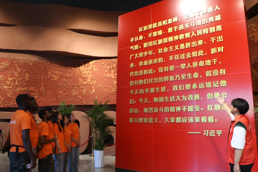 为扎实开展学习贯彻习近平新时代中国特色社会主义思想主题教育,深入学习贯彻习近平总书记视察安阳重要讲话精神,赓续红色精神血脉,激发青年爱党爱国热情,坚定青年听党话、跟党走的信念,7月1日,国际教育学院、苏梅国际学院“一山两河”学习考察实践团前往安阳林州,追寻习近平总书记足迹,学习红旗渠精神。国际教育学院、苏梅国际学院党委副书记刘凤、团委书记张宁宁和留学生管理办公室副主任迟文文带队,部分实践团队员和国际学生共15人参加了活动。