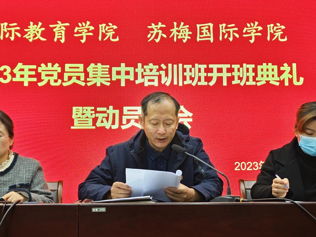 为加强党员教育管理,提高党员队伍建设质量,保持党员队伍的先进性和纯洁性。11月30日,国际教育学院、苏梅国际学院举办2023年党员集中培训班开班典礼暨动员大会,学院党政领导班子、全体教师党员、学生党员共40余人参加会议,党委宣传委员、副院长王君君主持会议。