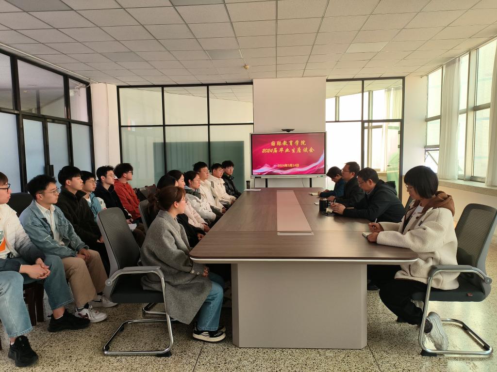 为深入了解学院2024届毕业生考研和就业情况,促进我院毕业生就业工作,3月14日上午,国际教育学院在学院会议室召开了2024届毕业生学生干部代表座谈会,院长吴艳兵、副院长沈军、副院长王君君、团委书记张宁宁和学生干部代表参加了会议。