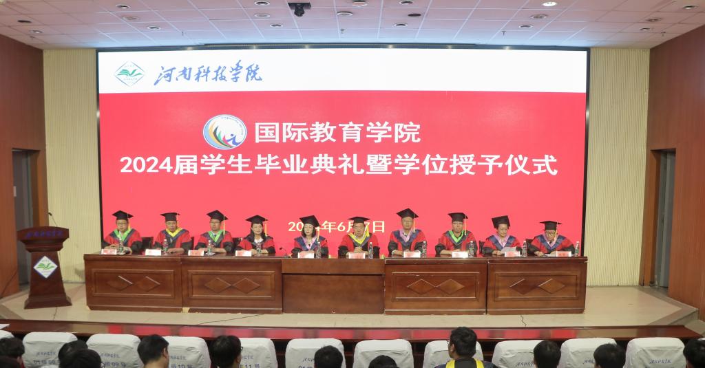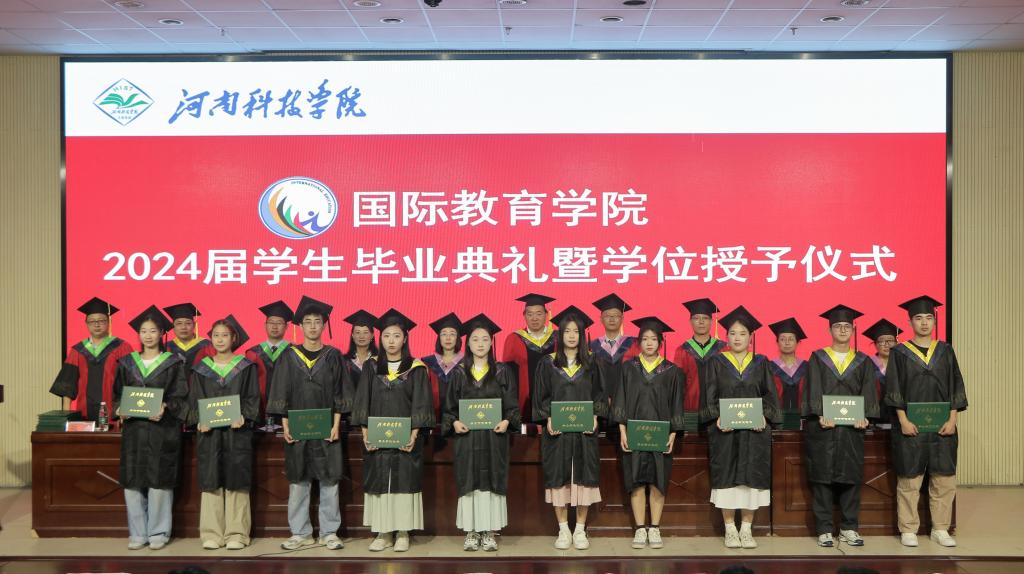 典礼在嘹亮的国歌声中拉开序幕,学院党委副书记刘凤宣读了《国际教育学院2024年优秀应届毕业生名单》,副院长沈军宣读了《河南科技学院关于授予宋毓洋等411名同学学士学位的决定》,台上领导老师为2024届毕业生代表扶正流苏,颁发学位学士证书并合影留念。