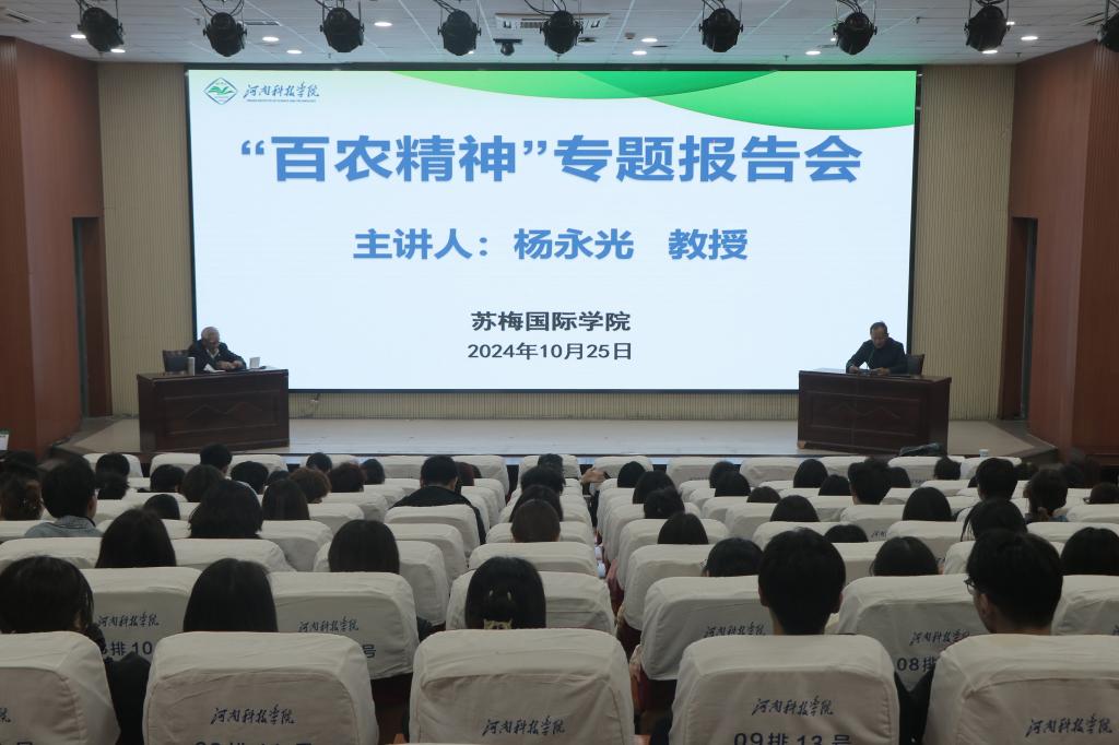 为进一步挖掘、传承和弘扬好“百农精神”,10月25日,苏梅国际学院在图书馆一楼学术报告厅举行“百农精神”专题报告会。本次报告会邀请杨永光教授主讲,由学院党委书记张平主持,学院全体教师及学生代表200余人参加会议。
