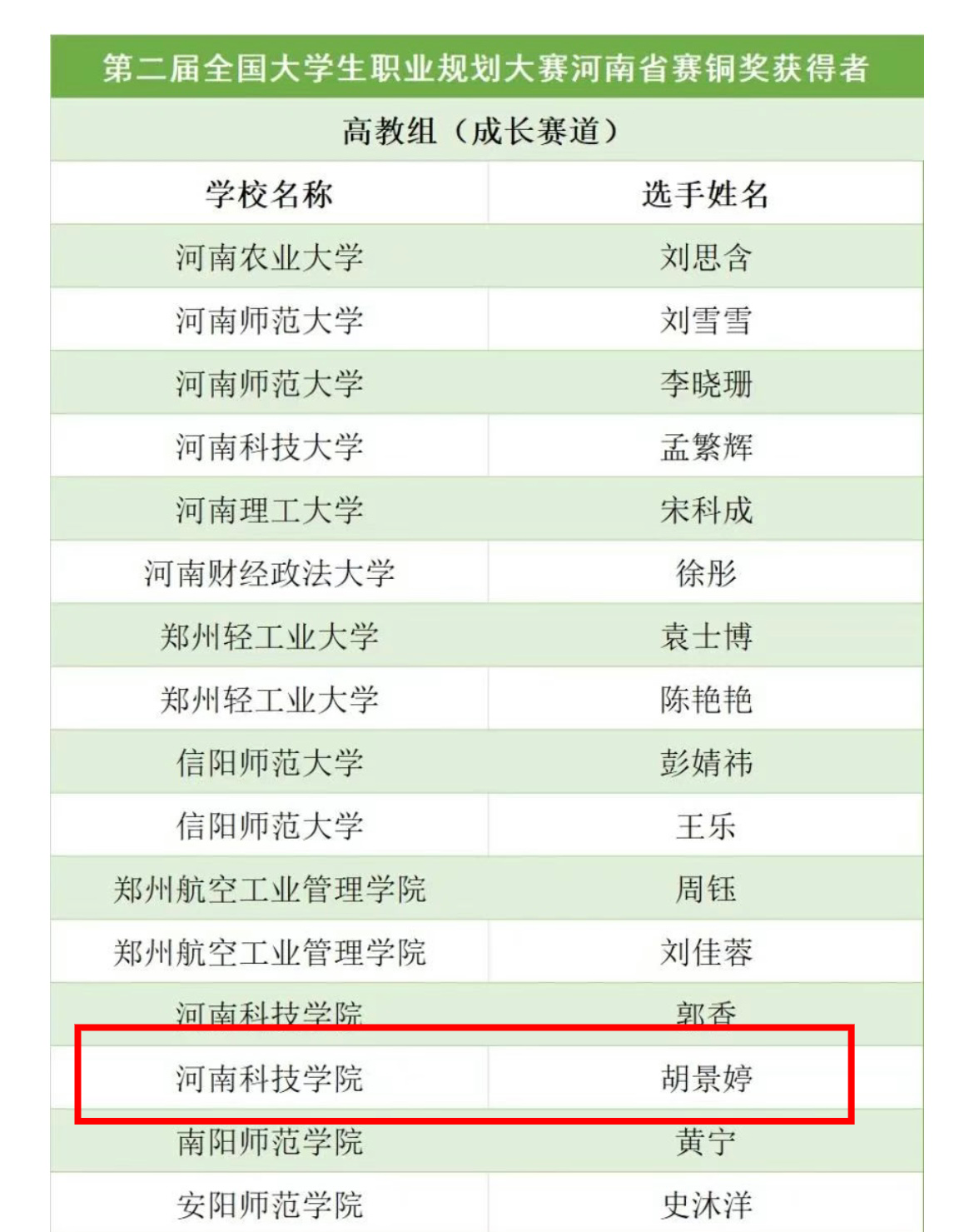 3月15日,第二届全国大学生职业规划大赛河南省赛圆满落幕。我院农学中外221班胡景婷同学凭借扎实的专业知识、清晰的职业目标和详实的规划方案,在高教组(成长赛道)本科生组中脱颖而出,荣获铜奖佳绩。