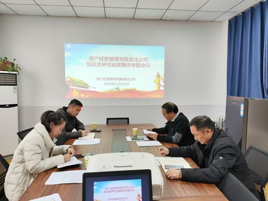 12月12日,资产公司党总支在一楼会议室召开巡察整改专题会议,落实校党委巡察反馈意见,研究部署巡察整改工作。党总支书记郎瑞红主持会议,党总支委员参加会议。