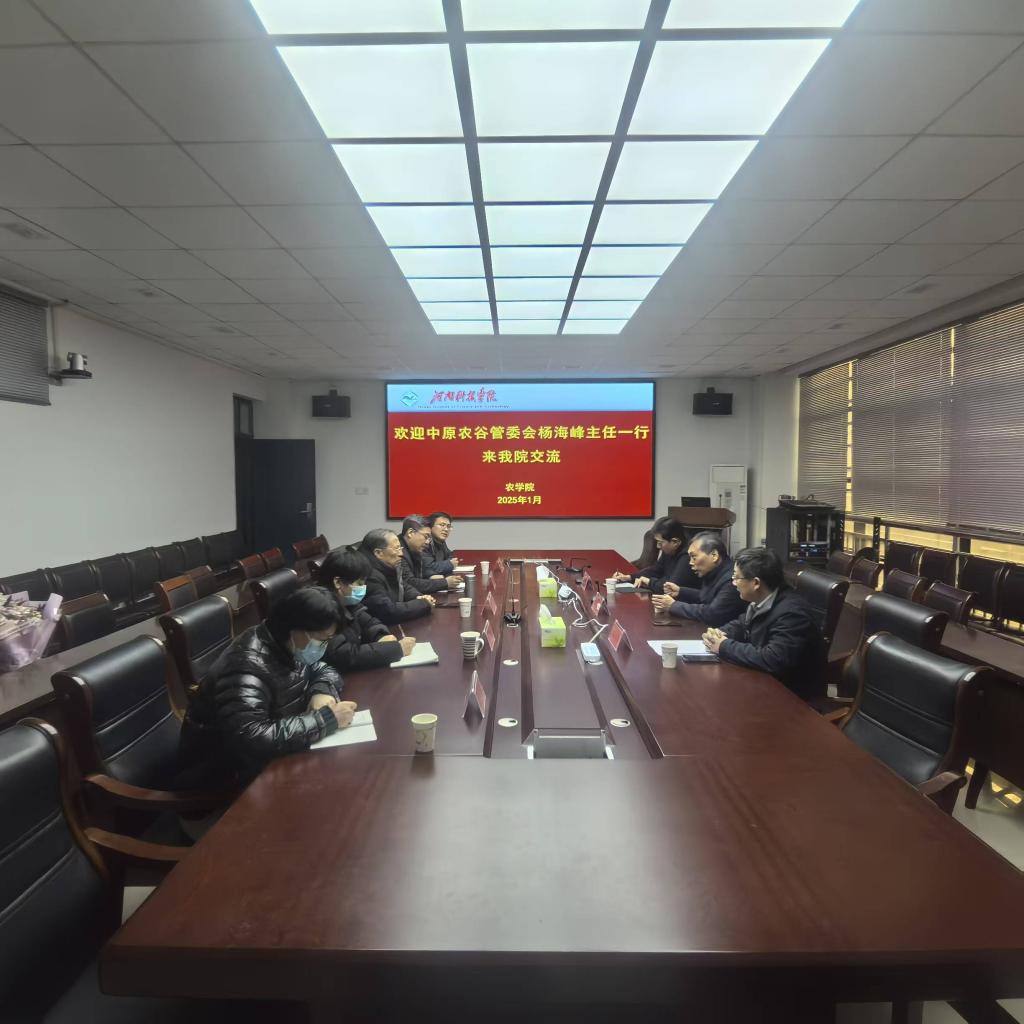 1月22日,中原农谷管委会副主任杨海峰、投资运营有限公司(下称中原农投)总经理张尽杰和中原农谷联合种业有限公司总经理范永胜一行3人来农学院考察交流。小麦育种专家茹振钢教授、实验室与设备管理处主任李勇超、农学院执行院长胡海燕、小麦研究中心主任陈向东、副主任董娜参加了交流座谈会。
