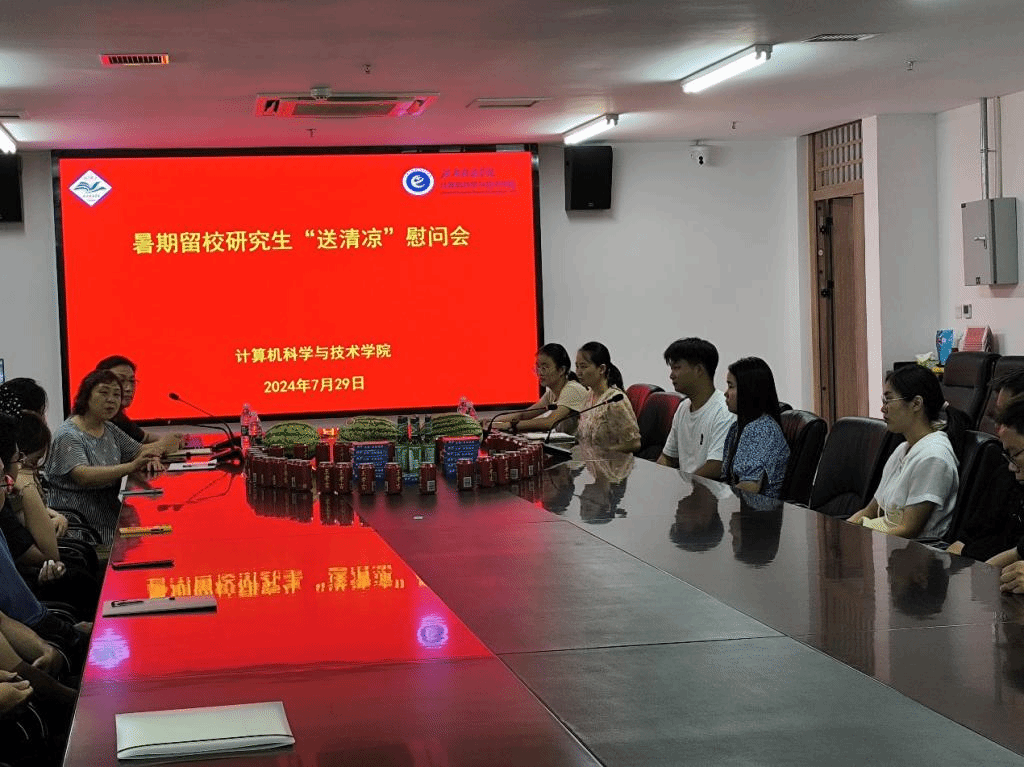 为深入了解计算机科学与技术学院暑期留校研究生学习情况,7月29日下午,在弘德楼A213会议室召开暑期留校研究生“送清凉”慰问会,计算机科学与技术学院党委书记周启、副院长李学勇及研究生秘书吴效莹出席,会议上亲切慰问暑期留校研究生。