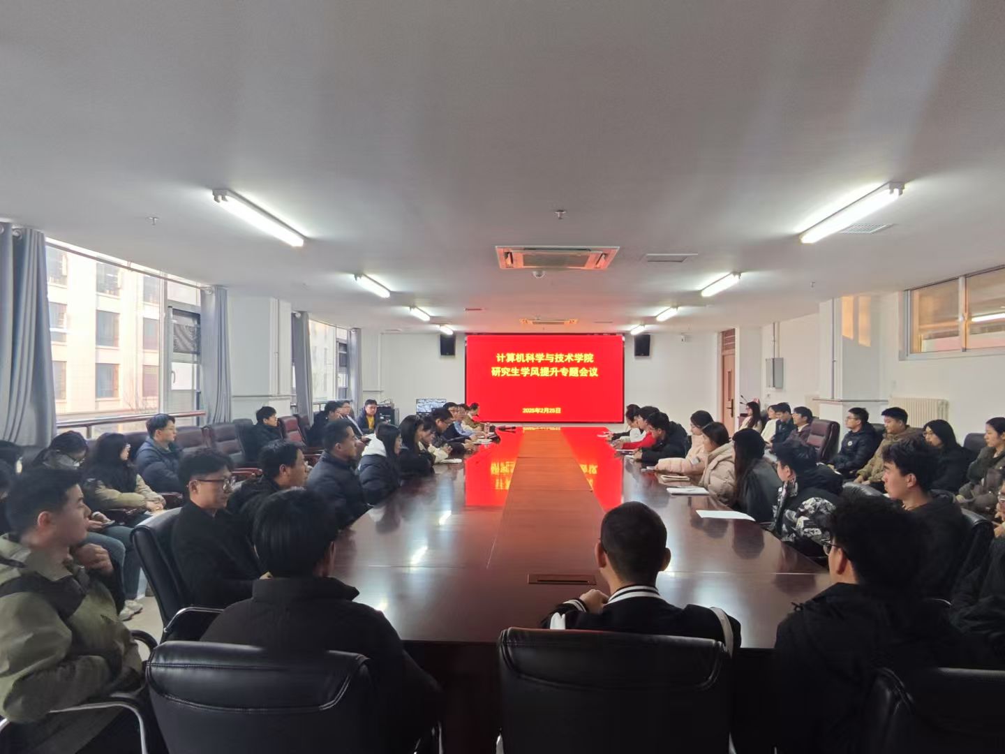 2月25日,计算机科学与技术学院在弘德楼A213会议室召开研究生学风提升专题会议。学院党委书记周启、院长高国红、副院长李学勇、研究生秘书吴效莹及全体硕士研究生参加会议。会议由李学勇主持,围绕学风建设、纪律管理、成果产出及就业支持等进行了部署。
