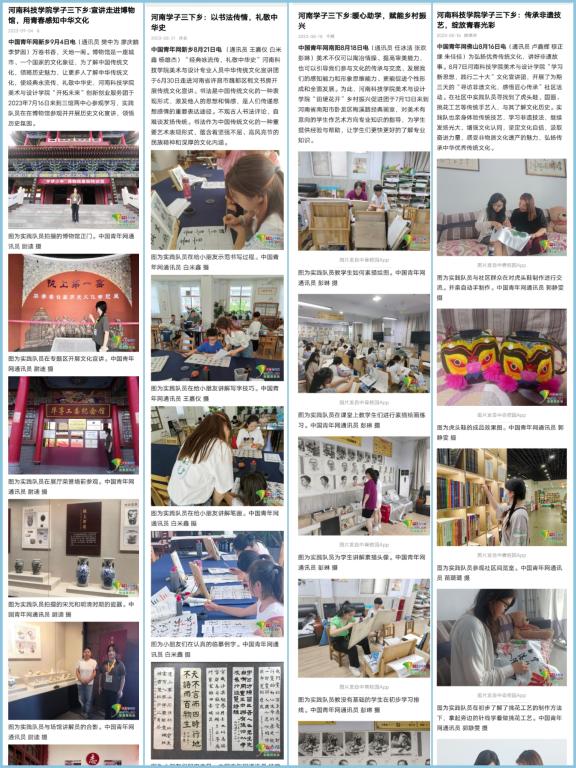 截至目前,美术与设计学院2023年大学生暑期“三下乡”社会实践活动得到中国青年网、今日头条、百度新闻、腾讯新闻、哔哩哔哩等多家媒体平台关注,已在中国青年网发表文章88篇,在外网媒体平台发表文章201篇,共计289篇。