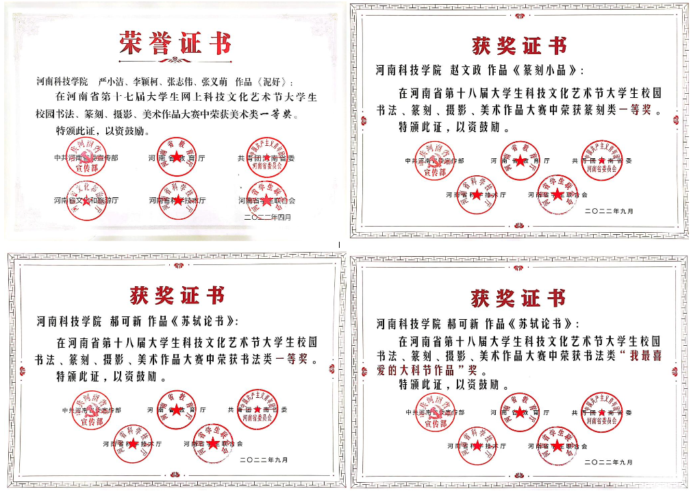 近日,从河南省第十八届大学生科技文化艺术节传来喜讯,我院参赛作品共荣获奖项14项,其中一等奖3项、二等奖2项、三等奖7项、优秀奖1项、“我最喜爱的大科作品”奖1项。