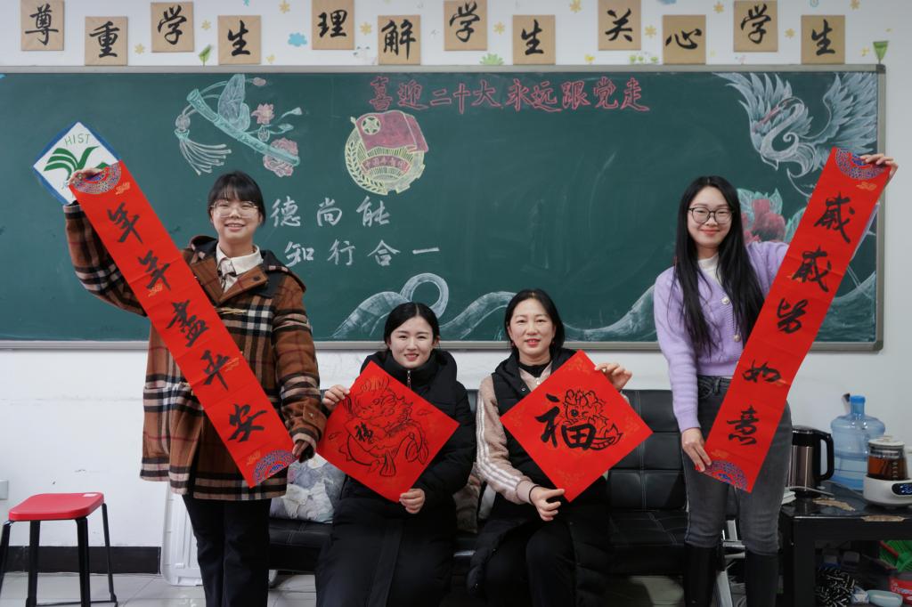 崭新红纸铺案头,翰墨飘香福满园。美术学子们充分发挥专业特长,将书法和美术相结合,挥毫泼墨,饱含真情地写下祝福,用心勾勒出吉祥图案,或苍劲有力,或婉转绵延。一停一顿、一起一落、一勾一描之间,各种字体的福字和形态俏皮的吉祥龙便跃然纸上。在辞旧迎新的特殊节点,同学们为老师们送上亲手书画的专属福字和春联,把新春祝福传递给老师们,为即将到来的龙年增添喜气和福气。每一个福字,每一对春联,都饱含美好的祝福与期盼。老师们在收到祝福后,品评着各式各样“生肖福”和春联的蕴意,频频竖起大拇指称赞书法、美术的魅力,纷纷表示要把作品挂在办公室和家里,将“福”气传递给更多的人,现场师生们脸上都洋溢着幸福的笑容。